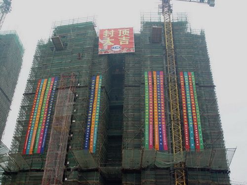 118上午958分,十七冶城建公司芜湖项目部海创中兴花园4#楼工地举行简短的庆贺仪式,住宅4#楼结构封顶第一吊砼在飞溅的花絮中升空入模。