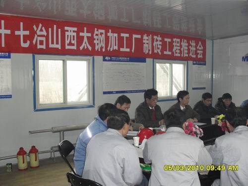 35上午,十七冶山西太钢工程项目部召开了“中国十七冶山西太钢加工厂制砖工程推进会”,集团公司总工程师尹万云总经理助理王青山、副总工程师李中元机电公司党委书记周美初、太钢冶金除尘灰资源化工程项目部工程部部长梁海全和施工单位及技术负责人、项目部全体管理人员参加了推进会。