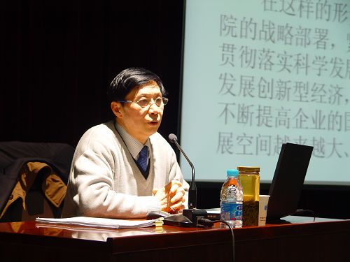 江苏省经济学会副秘书长、江苏省委党校经济学教研室主任储东涛作了《经济形势报告》。他从四个方面阐述了当前的经济形势:一、“后危机时期”国际经济环境的重大变化;二、我国应对危机取得的重大进展及未来走势;三、当前企业转型升级的倒逼机制和历史机遇;四、当前企业转型升级的战略指向和制度保障。