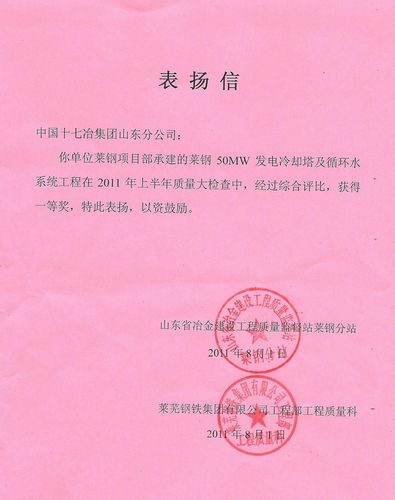日前,山东分公司承建的莱钢50MW发电冷却塔及循环水系统工程,在莱钢集团组织上半年质量大检查中喜获一等奖。