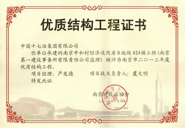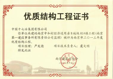 近日,由南京市建筑业协会组织的南京市“优质结构工程”评审工作圆满结束,由中国十七冶集团承建的中和村B区经济适用房01#02#住宅楼顺利通过专家组的审查,获得了南京市2013年度“优质结构工程”奖。
