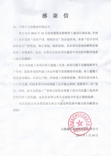 日前,安徽鑫科新材料股份有限公司向中国十七冶集团发来感谢信,对我公司在安徽鑫科新材料有限公司高精铜带土建项目建设中付出的艰辛劳动表示衷心感谢。