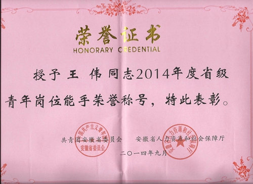 近日,从共青团安徽省委员会、安徽省人力资源和社会保障厅获悉,中国十七冶集团房屋工程技术公司员工王伟荣获2014年度安徽省青年岗位能手荣誉称号。