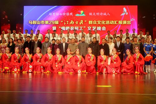 1216晚,由马鞍山市委宣传部、文化委员会主办,市文化馆承办,中国十七冶集团协办的第29届“江南之花”汇报演出暨“情暖农民工”文艺晚会在市大剧院举行。中国十七冶集团近800名农民工观看了专门为他们组织的专场慰问演出。马鞍山市委常委、宣传部长盛厚林,副市长吴桂林、王艳,中国十七冶集团总经理刘安义,副总经理蔡进、王振堂、朱广侠,董事会秘书汤小建等领导和农民工朋友一起观看了演出。