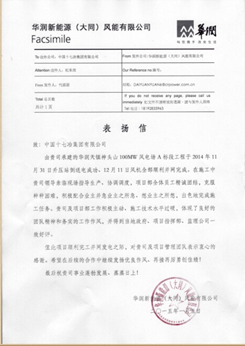 日前,华润新能源(大同)风能有限公司致信中国十七冶集团,感谢风力与太阳能发电工程技术公司承建施工的华润天镇神头山100MW风电场A标段工程顺利实现并网发电,表扬公司领导亲临施工现场调度指挥,项目部全体员工精诚团结、与协作队伍通力合作,急业主所急,想业主所想,以客户满意为荣,以快速、高效、优质地出色完成了施工任务。