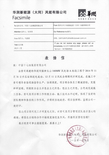 华润新能源(大同)风能有限公司向公司致表扬信