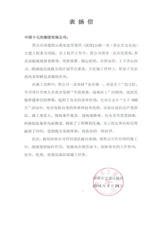 近日,中国十七冶集团收到普洱市交通运输局发来的表扬信,表扬由中国十七冶集团交通工程技术公司承建的云南安普公路5标项目在施工质量、安全管理等方面工作完成较好,得到了交运局的高度评价和认可。