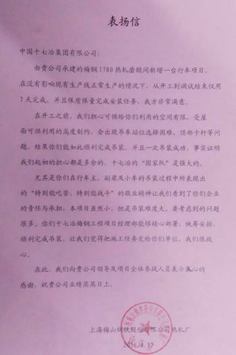 4月20日下午,中国十七冶集团冶金工程技术公司承建的上海梅山钢铁股份有限公司热轧厂1780热轧磨辊间新增一台行车顺利完成载荷试验,该工程全部施工任务圆满完成。梅钢公司热轧厂特表扬信以示感谢。