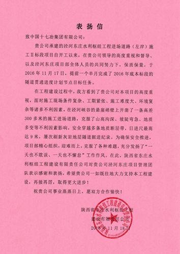 1118日,陕西省东庄水利枢纽工程建设有限责任公司向中国十七冶集团发来表扬信,表扬十七冶交通工程技术公司泾河东庄水利枢纽工程道路Ⅱ标段项目经理部为优质高效推进工程建设,提前完成标节点目标所作出的努力。