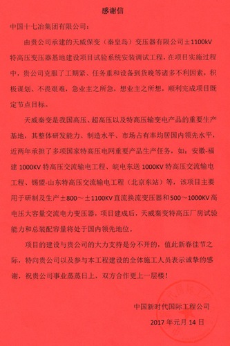 116日,中国十七冶集团收到中国新时代国际工程公司发来的感谢信,感谢十七冶冶金工程技术公司在承建天威保变(秦皇岛)变压器有限公司±1100kV特高压变压器基地建设项目试验系统安装调试工程中,克服了工期紧、任务重和设备到货晚等诸多不利因素,积极谋划、不畏艰难,急业主之所急,想业主之所想,113日一次性通过业主验收,顺利完成项目既定节点目标。