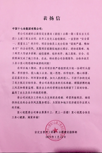 表扬信指出,自工程开工至交工验收期间,项目部始终坚持“安全第一,质量至上”的方针,充分发挥“高效严谨,精细务实”的企业作风,积极克服项目前期征地拆迁滞后、进场道路难、施工难度大等诸多困难,勇担重任,精心组织,站位前移,组织有序,优质高效安全完成各项施工任务。高度赞扬了十七冶员工无私奉献、顽强拼搏的施工风范及尊重监理、服务业主的经营理念,同时希望要再接再厉,继续保持优良的企业作风和服务理念,为国家和地方经济建设作出更大贡献。