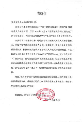 2月27日, 鞍钢联众(广州)不锈钢有限公司向中国十七冶集团发来表扬信,表扬冶金工程技术分公司项目管理团队对鞍钢联众热轧HSM产线2019年修人力统包工程的辛勤付出和做出的积极贡献。