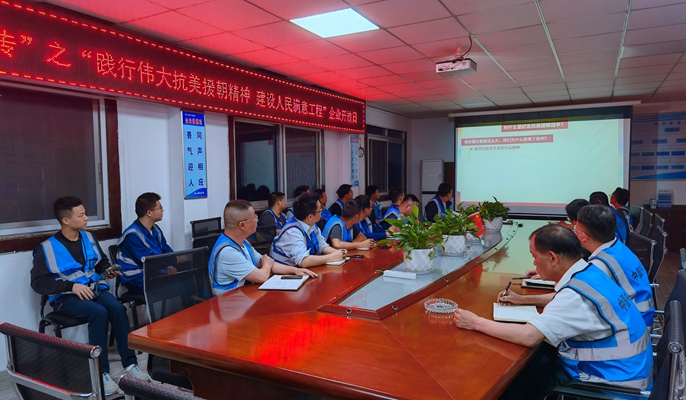 在学党史、悟思想环节,全体与会代表观看了《抗美援朝保家卫国》纪录片,并参加了党课学习,深入领会“抗美援朝精神”的深刻内涵,充分认识其历史价值,准确把握其时代意义。党课结束后,大家一致表示将始终牢记初心使命,不断发扬斗争精神,勇于战胜一切艰难险阻,脚踏实地做好施工建设,为实现中华民族伟大复兴的中国梦努力拼搏奋斗。项目负责人结合视频,就项目标准化建设、安全文明施工、预制梁场及桥梁工程建设、智能化数控设备、智能喷淋养护系统、标准件展示、胎膜架、安全体验区、智慧工地应用、四新技术应用、工艺微改创新、梁板标准化施工及外观质量提升等进行了讲解,利用BIM模型演示建设过程,彰显项目精细化、技术化、安全化管理水平。同时项目党支部通过展板、照片等重点介绍了项目在当地践行央企社会责任、党建工作开展等情况,并带领广大党员重温了入党誓词,更加坚定了党员初心。党支部将继续发挥战斗堡垒作用和党员的先锋模范作用,发扬团结一致、无私奉献的革命精神,将“抗美援朝精神”落到实处,全力冲刺赶工期,充分展现党员干部“干在实处、走在前列”的风采。