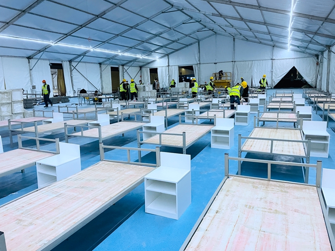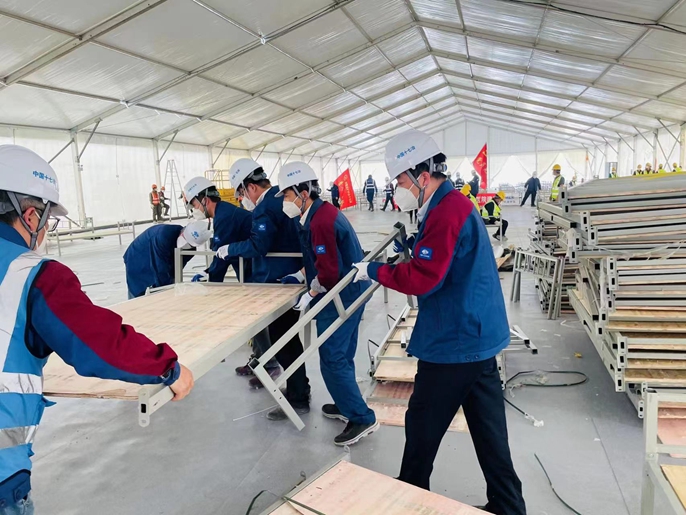 面对严峻工期压力,援建工作组根据现场实际情况强化统筹协调,将每一道工序和时限要求细化到参建单位和班组,全员领命冲锋推进混凝土浇筑、水电安装、PVC地板安装、床位铺设等工作。4月18日下午2点,党员突击队、青年突击队迅速开展“党员干部搭把手、走在前、干在先”主题实践活动,在公司党委主要领导的带头作业下,党员干部激情踊跃,从下午到夜间、再到凌晨,和工人清理场地,昼夜组装床铺、铺设床位、搬运被褥床头柜,持续发起保障交工大干冲刺。截止到4月19日上午6:00,现场铺设完成床位近2200张,水电安装过半,PVC地板安装约2万平方米,向“咫尺之遥”的交付验收发起“纵身一跃”。
