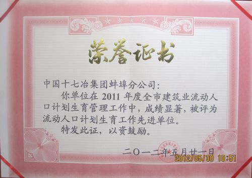 530,在蚌埠市住建委召开的有60多家建筑单位参加的全市建筑业党建暨流动人口计划生育工作会议上,十七冶蚌埠分公司项目获“先进党支部”和“流动人口计划生育工作先进单位”称号,受到大会表彰。