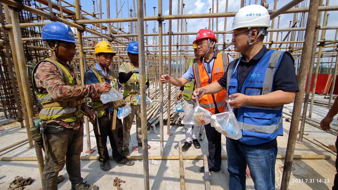 开展送清凉活动。8月1日,项目部开展送清凉活动,慰问坚守施工一线的作业人员,给他们送上了藿香正气水、王老吉、牛奶、西瓜等防暑药品和清凉物品,帮助他们在高温天气下调整情绪和身体状态,确保安全生产和身体健康。