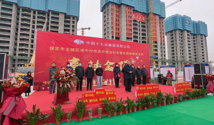 保定市主城区城中村连片开发ABO项目(二标段)位于保定市国家级高新区,是保定市主城区城中村改造一期重点项目之一和保定市委市政府主导的全市1号民生工程、1号发展工程。项目共包括13个自然村。中贤台安置区由九栋高层住宅楼、地下车库及邻里中心、幼儿园组成,总建筑面积约22.27万平方米,住宅总数为1362户。此次主体结构封顶的6#楼地上19层,地下2层,1层夹层。