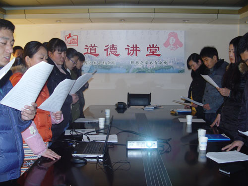 “道德讲堂”是创建安徽省第十届文明单位所赋予的新要求和新内容,从去年四季度开始,该公司按照要求坚持按期开办,并注重日常活动资料的收集和归类,为公司申报第十届省级文明单位积累了完整资料。在“道德讲堂”上,大家齐唱《公民道德歌》,唱出了“人生道路上有德才能行”的美好心声,《好人好梦》唱出了好人终有好梦的美好祝愿;道德故事《闵损芦衣》讲的是珍惜家庭、尊老爱幼、倡导和睦的亲情;“行时时之方便,作种种之功德”等20条《劝善辞》给大家以启发和思考;主持人还带领大家一起向道德讲堂背景上的“德”字鞠躬,行遵德礼。最后,与会人员就每个人在最近的工作、生活中亲身感受或是听说到的与“善心”有关的故事,进行了交流,并谈自身的感悟和体会。